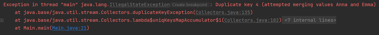 toMap 형태는 스트림의 각 원소가 고유한 키에 매핑되어 있을 때 적합하다. 만약 같은 키를 사용한다면 IllegalStateException 을 던지며 아래와 같이 종료된다.