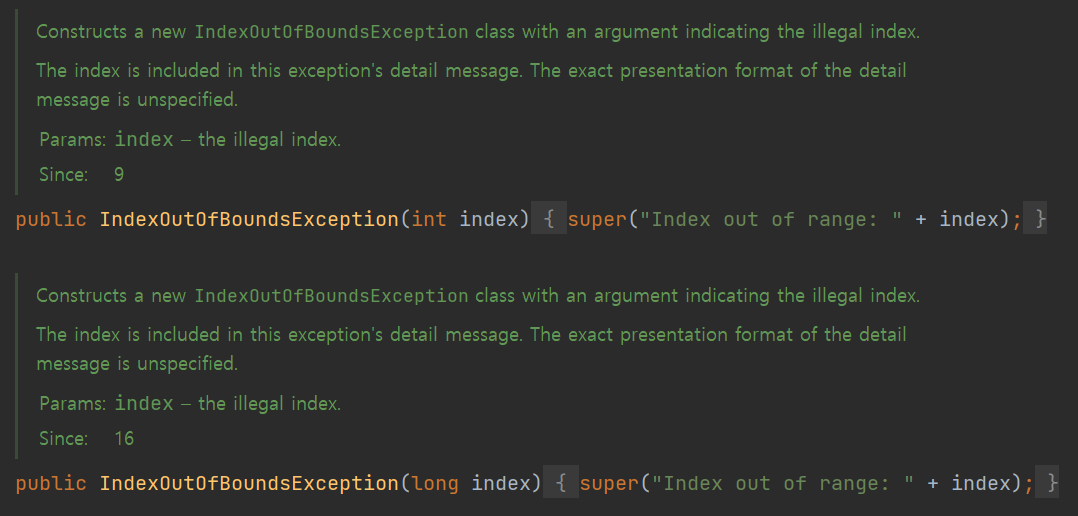 단순히 String 을 받는 것 보다, 예외 메시지에 필요한 정보들을 모두 받아 상세 메시지에 구현해 놓는 방법이다. 자바 9 이후의 IndexOutBoundsException 은 정수 인덱스 값을 받는 것이 포함되었지만, 최솟값과 최댓값을 받진 않는다.